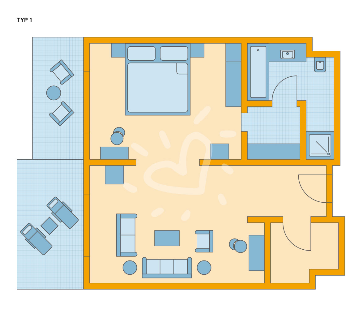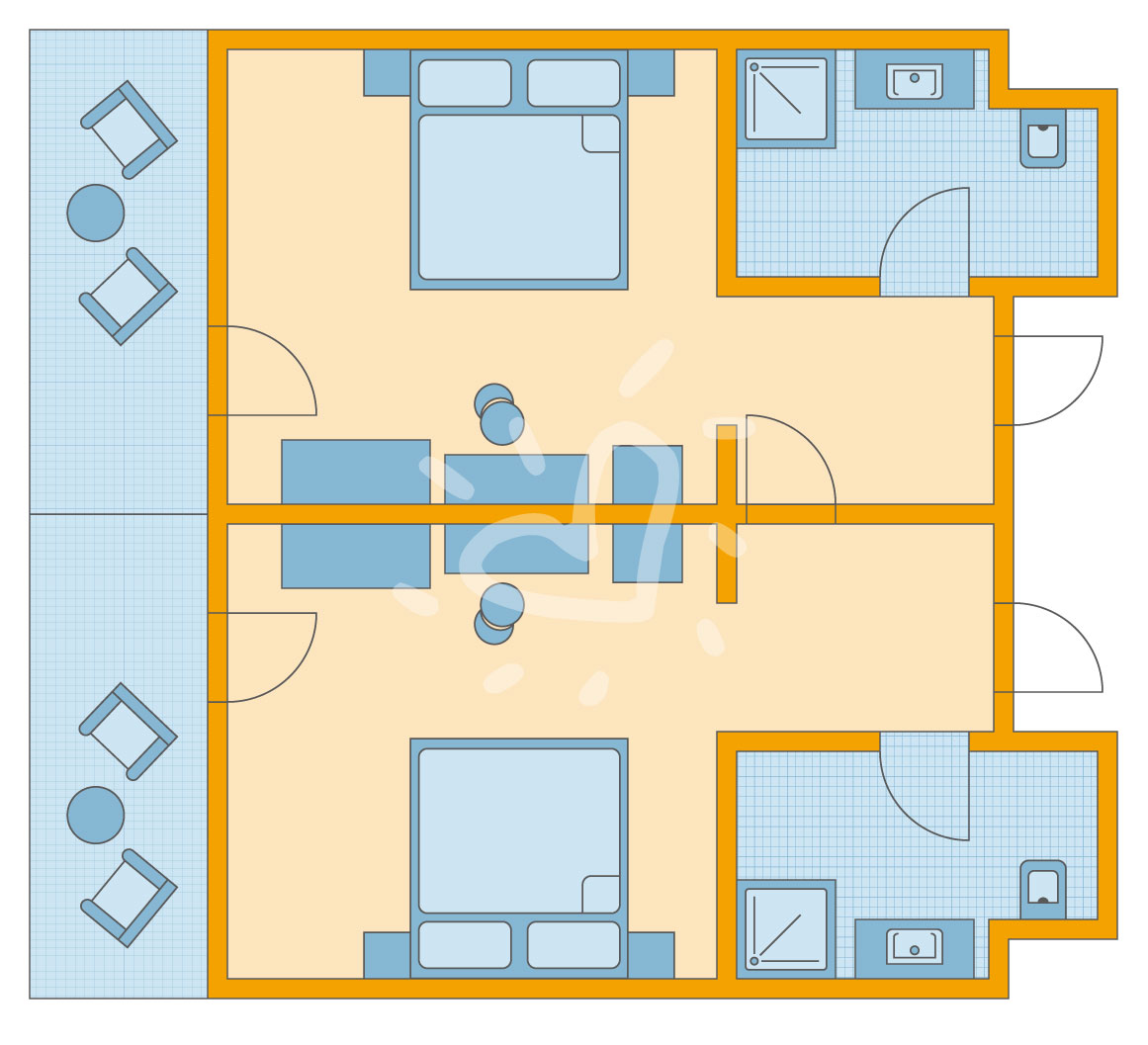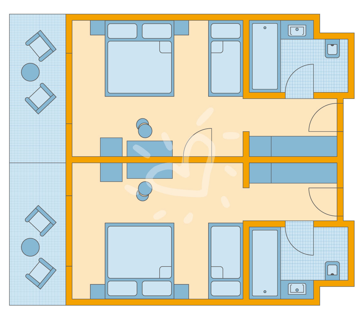 Details anzeigen2 Doppelzimmer mit Verbindungstür für 4 Personen, je Doppelzimmer ein Bad mit Badewanne, ohne Meerblick/ Poolblick. Gesamtgröße ca. 53 m². Zustellbett: ca. 90 x 200 cm.