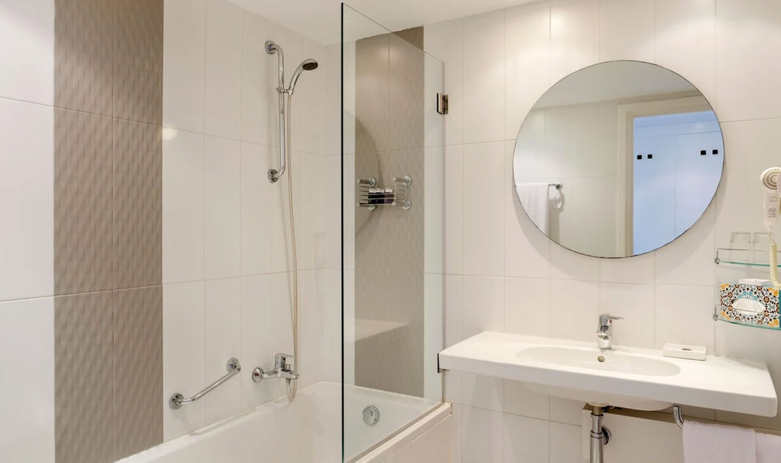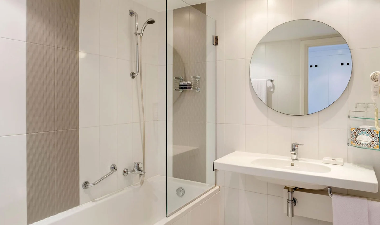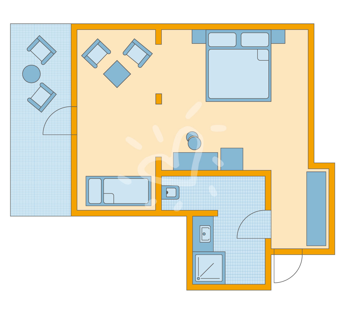 Details anzeigenBad mit Badewanne, ohne Meerblick/Poolblick, ca. 27 m². 3. Festbett im Dreibettzimmer: ca. 90 x 200 cm. Einzelzimmer sind Doppelzimmer zur Alleinbenutzung.