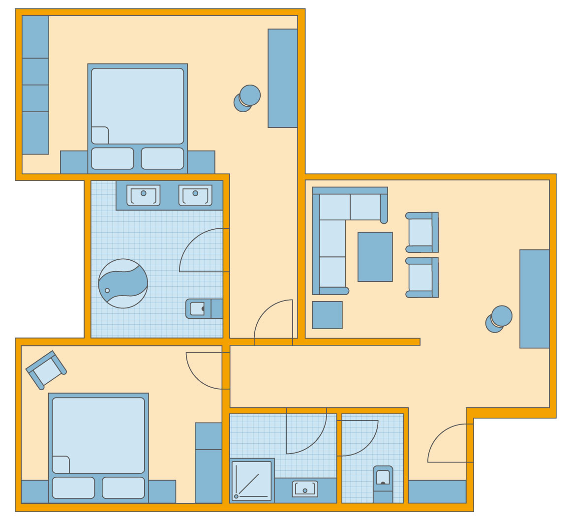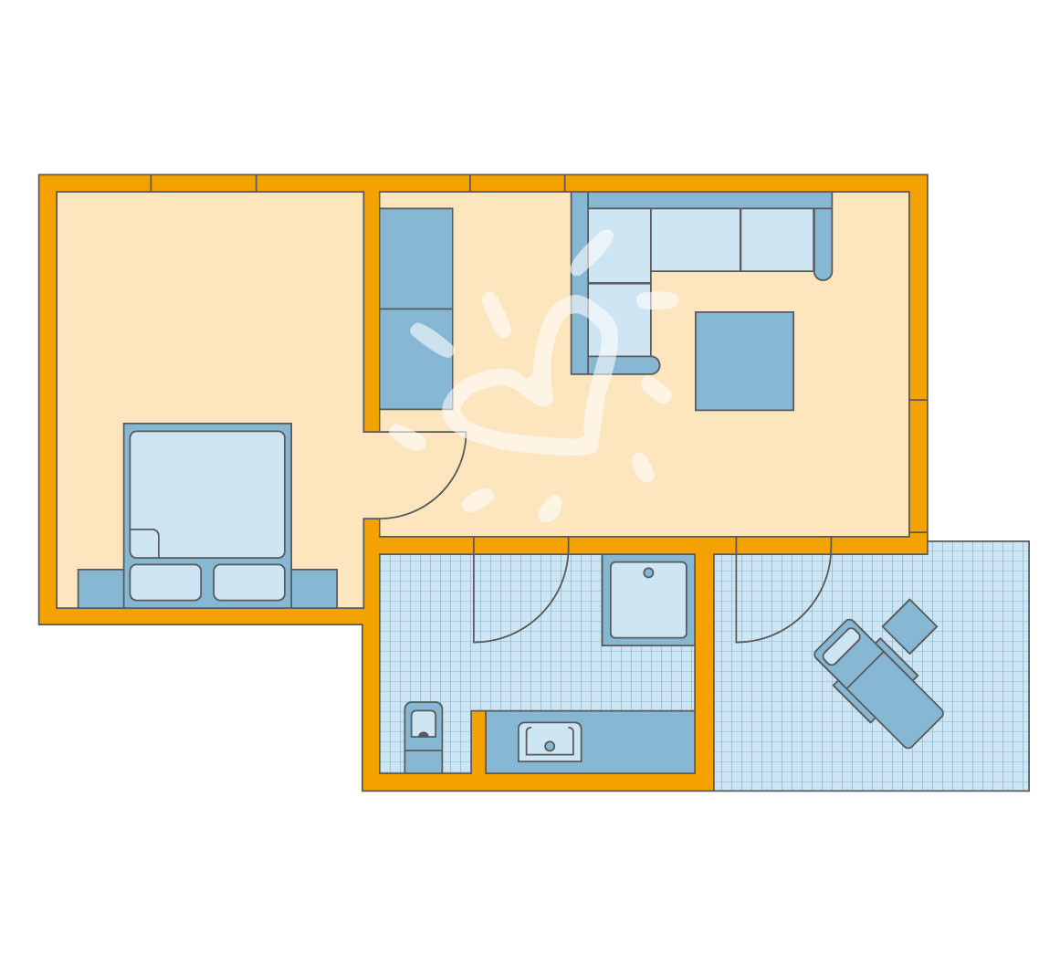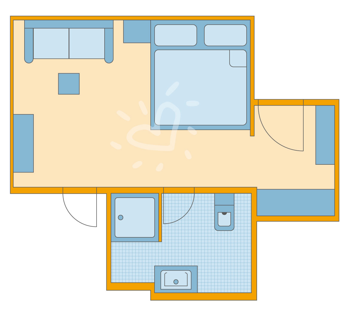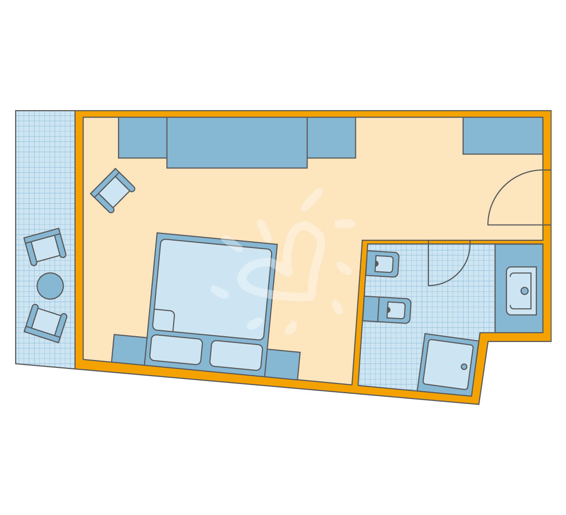 Ausstattung: Bad mit Dusche, WC, Föhn, TV, Telefon, Minikühlschrank, Safe, Terrasse und Klimaanlage/Heizung. Die hier abgebildeten Zimmerpläne stellen Wohnbeispiele dar.SafeWLANTVKlimaanlage -