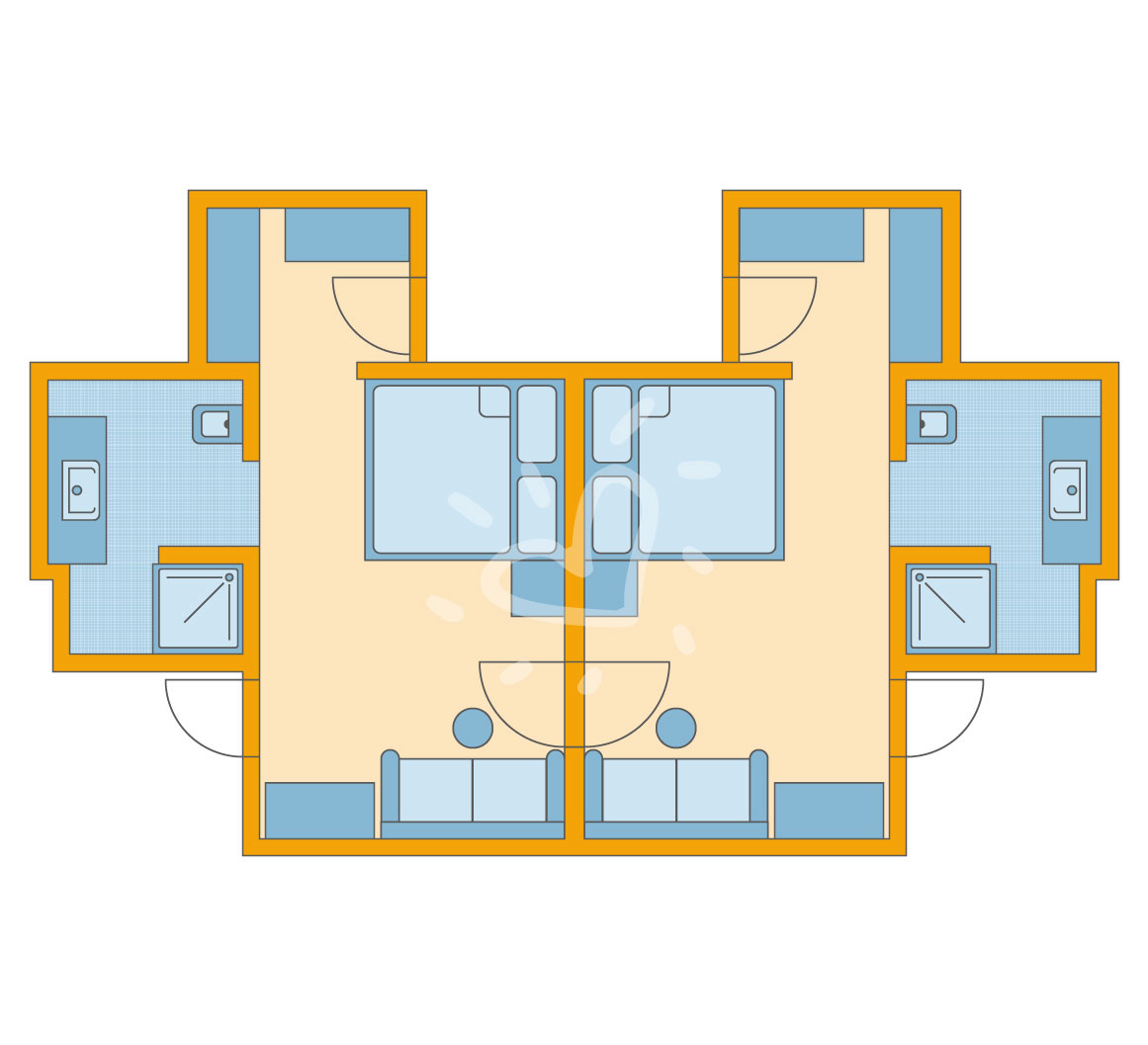 Details anzeigen2 Doppelzimmer mit Verbindungstür für 4 Personen, jeweils kombinierter Wohn-/Schlafraum, ohne Meerblick, ca. 42 m². Ausziehbares Schlafsofa: ca. 160 x 200 cm.