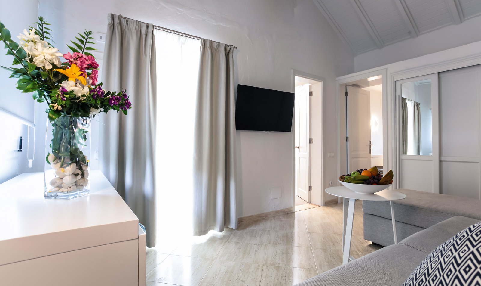 Details anzeigen2 Schlafzimmer, Wohnzimmer, großes Bad mit Whirlpool, WC und 2 Waschbecken, kleines Badezimmer mit Dusche, Waschbecken und separatem WC, Terrasse mit Teakholz-Liegestühlen. Ausgestattet mit TV, Kaffee-/Tee-Station, Bügeleinrichtungen, Klimaanlage, mit Meerblick. Ca. 75 m². Frühstücks-Roomservice gegen Gebühr. Zustellbett: ca. 90 x 190 cm.