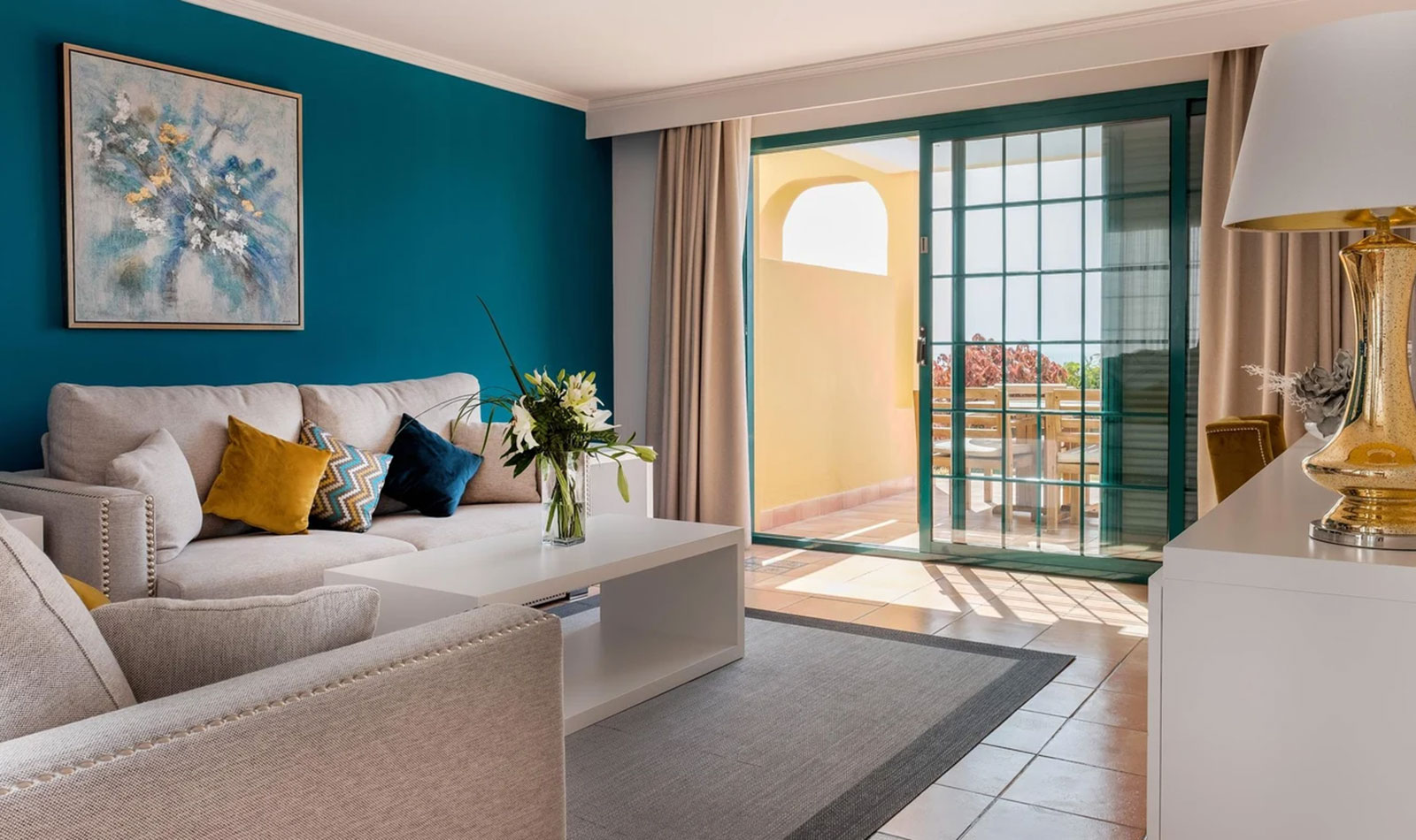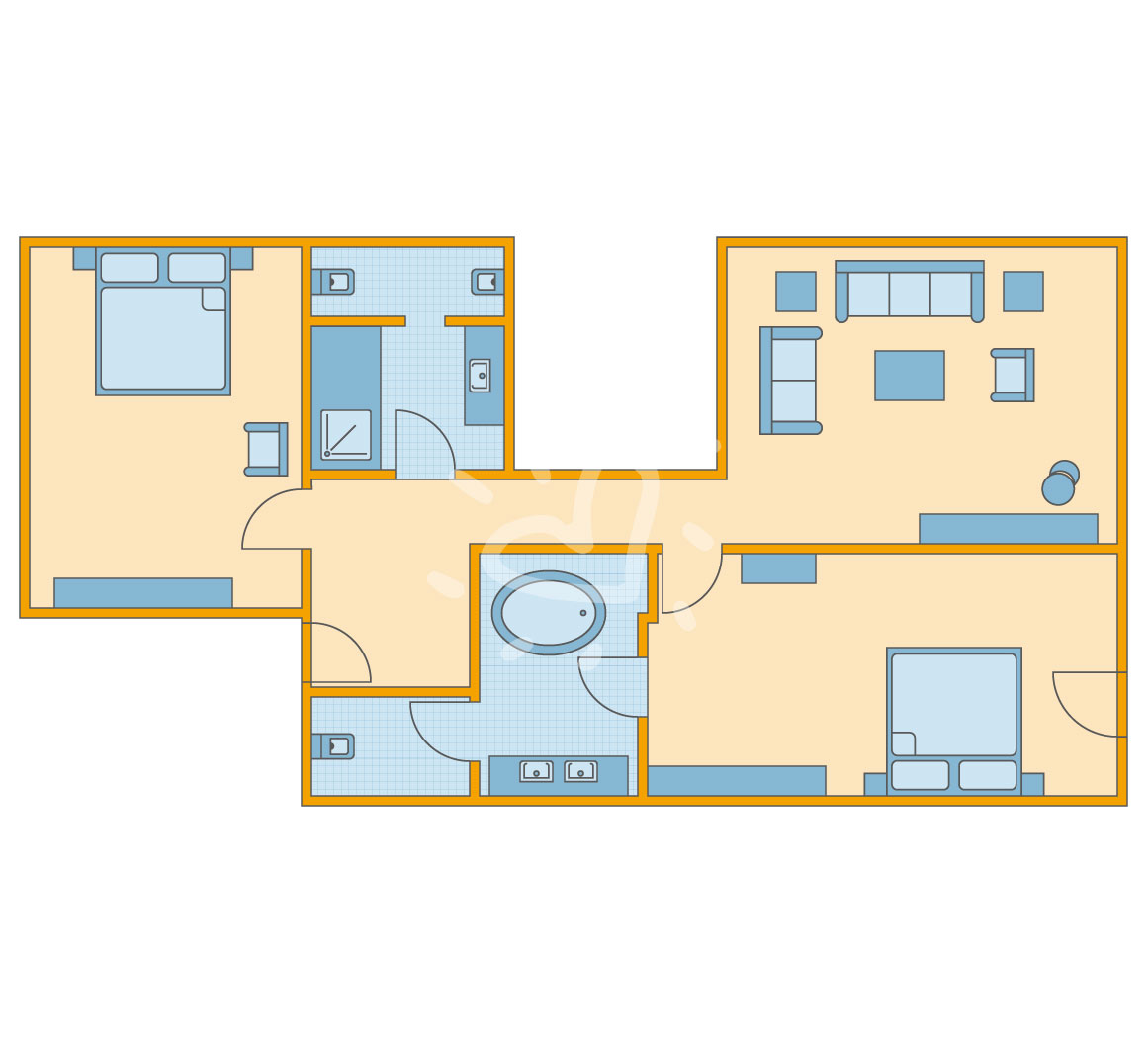 Details anzeigen2 Schlafzimmer, Wohnzimmer, großes Bad mit Whirlpool, WC und 2 Waschbecken, kleines Badezimmer mit Dusche, Waschbecken und separatem WC, Terrasse mit Teakholz-Liegestühlen. Ausgestattet mit TV, Kaffee-/Tee-Station, Bügeleinrichtungen, Klimaanlage, ohne Meerblick. Ca. 75 m². Frühstücks-Roomservice gegen Gebühr. Zustellbett: ca. 90 x 190 cm.