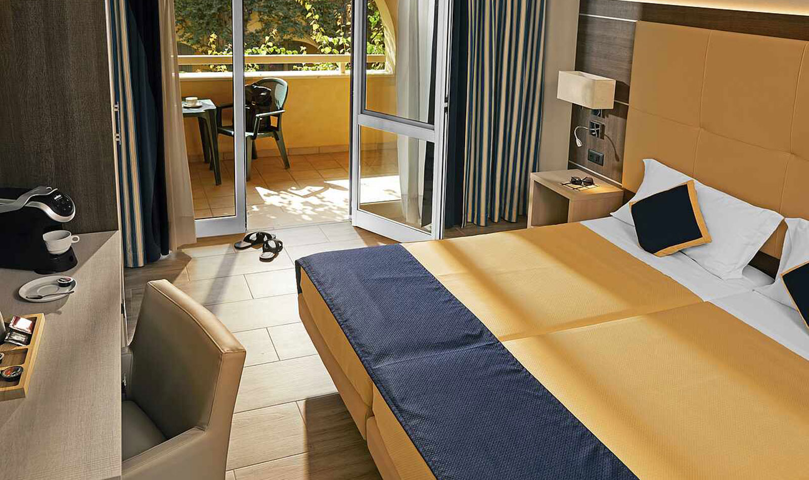 Klimaanlage: individuell regelbar, zentral gesteuert Fußboden: Fliesenboden Safe: ohne Gebühr Minibar: bei Ankunft gefüllte Minibar mit Wasser und Softdrinks, zusätzliches Wasser während des Aufenthaltes nach Bedarf, jeweils ohne Gebühr Telefon, Internet: WLAN/WiFi: ohne Gebühr, Fernseher: Flatscreen, deutsches Programm, Sat-TV Roomservice: auf Anfrage, gegen Gebühr; Reinigungsservice: täglich Dusche, WC, Föhn Balkon oder Terrasse: mit SitzgelegenheitSafeWLANTVKlimaanlageBalkon -