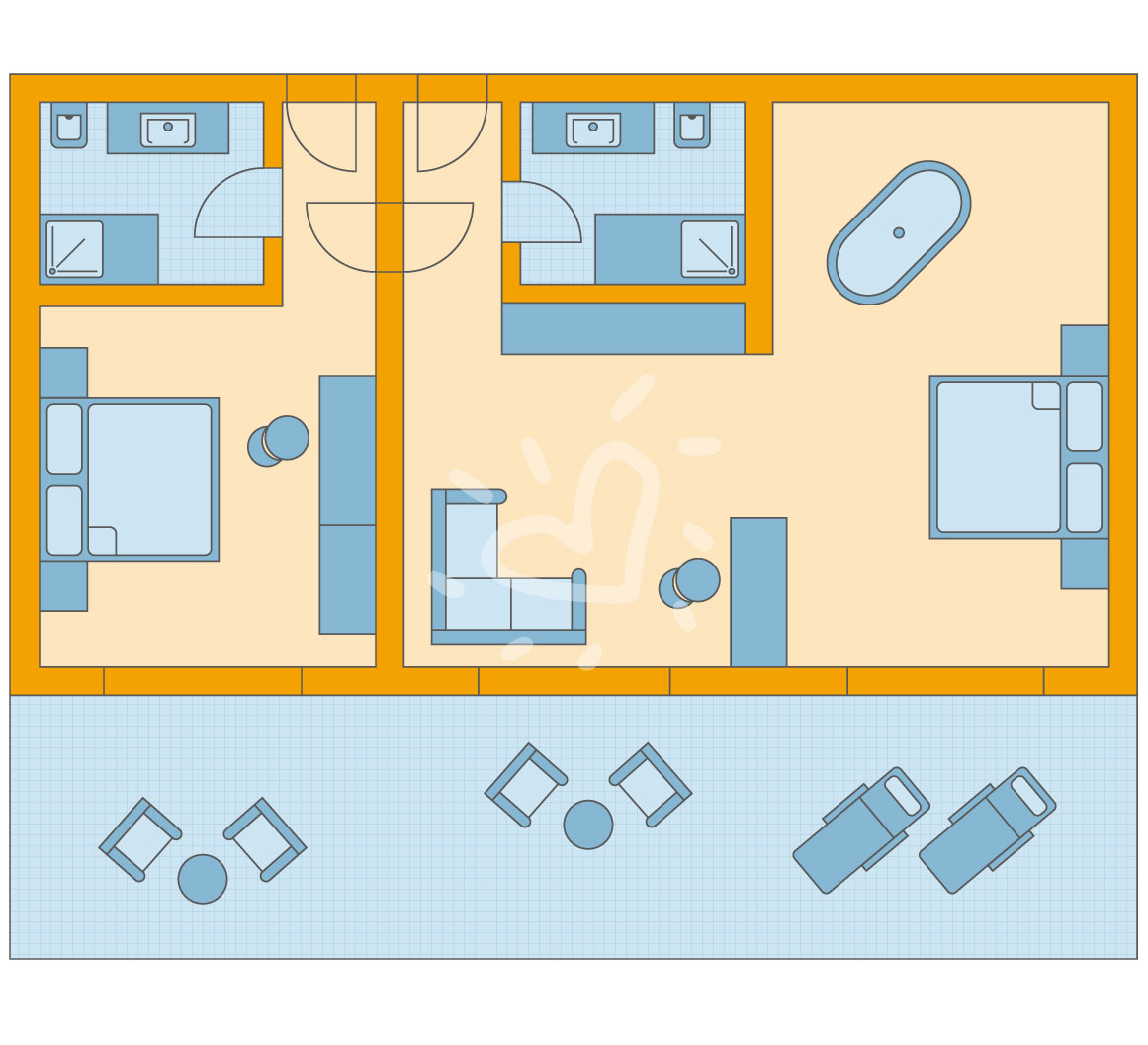 Details anzeigenNichtraucherzimmer, ca. 50 m², letzte Komplettrenovierung 2019. Gesamtanzahl der Räume in diesem Zimmertyp: 2, Aufteilung wie folgt: Wohnzimmer, 1 Schlafzimmer. 1 Doppelbett. Mindest-/Maximalbelegung: mind. 2 Erwachsene / max. 3 Erwachsene. Mindestalter im Zimmer: 16 Jahre