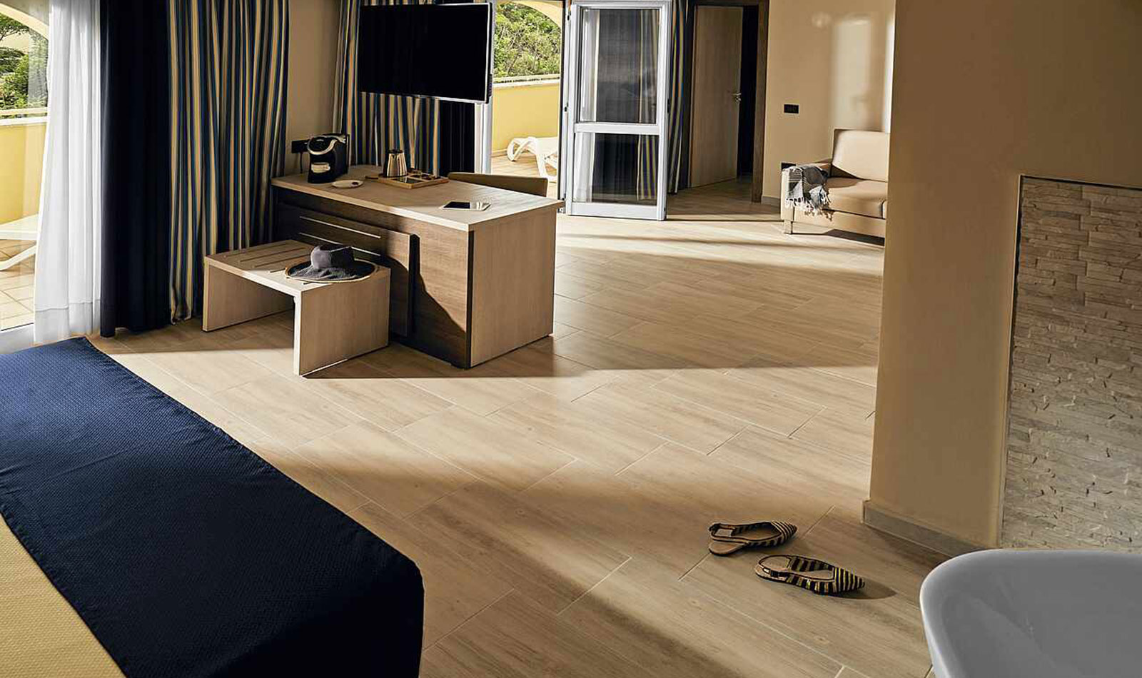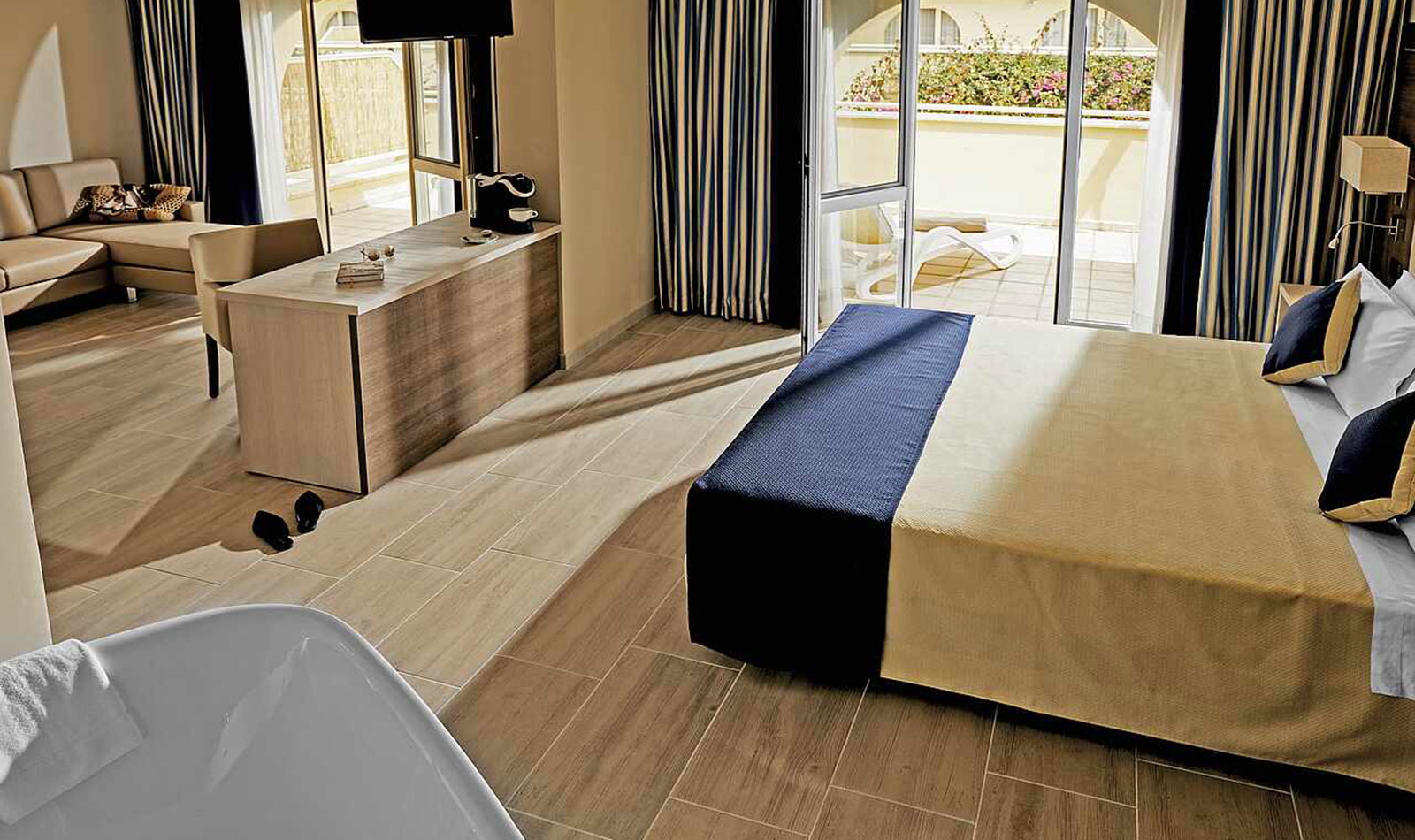 Klimaanlage: individuell regelbar, zentral gesteuert Fußboden: Fliesenboden Safe Minibar: bei Ankunft gefüllte Minibar mit Wasser und Softdrinks, zusätzliches Wasser während des Aufenthaltes nach Bedarf, jeweils ohne Gebühr Telefon, Internet: WLAN/WiFi, Fernseher: Flatscreen, deutsches Programm, Sat-TV Roomservice: auf Anfrage, gegen Gebühr; Reinigungsservice: täglich Dusche, WC, Föhn Balkon oder Terrasse: mit SitzgelegenheitSafeWLANTVKlimaanlageBalkon -