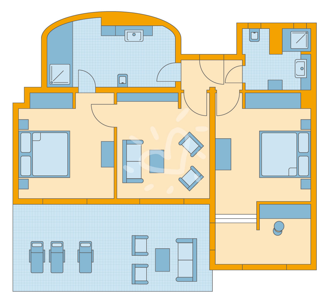 Details anzeigenNichtraucherzimmer, ca. 69 m², Meerblick Gesamtanzahl der Räume in diesem Zimmertyp: 3, Aufteilung wie folgt: Wohnzimmer, 2 Schlafzimmer 2 Doppelbetten (180x200cm), 1 Schlafsofa (140x160cm), Babybett: ohne Gebühr Mindest-/Maximalbelegung: mind. 3 Erwachsene / max. 4 Erwachsene, 1 Kind/Jugendlicher 2-17 Jahre und 1 Kleinkind unter 2 Jahren. Bei Belegung mit 3 Erwachsenen auch für 2 Kleinkinder unter 2 Jahren geeignet Die Unterbringung der 5. Person erfolgt auf dem Schlafsofa