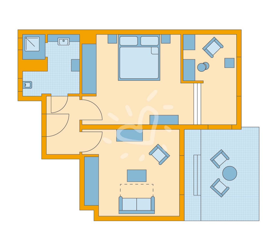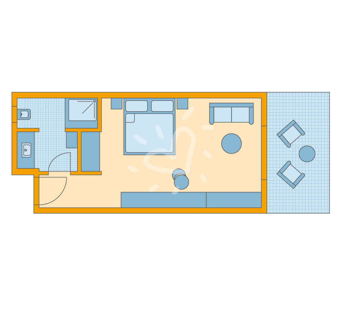 Fußboden: Laminat Safe: ohne Gebühr Deckenventilator Sitzecke Kühlschrank Telefon, Fernseher: Flatscreen, deutsches Programm, Sat-TV, Radio Reinigungsservice: täglich Dusche, WC, Bademantel, Föhn, Kosmetikspiegel Balkon oder Terrasse: mit SitzgelegenheitSafeWLANTVKlimaanlageBalkon -