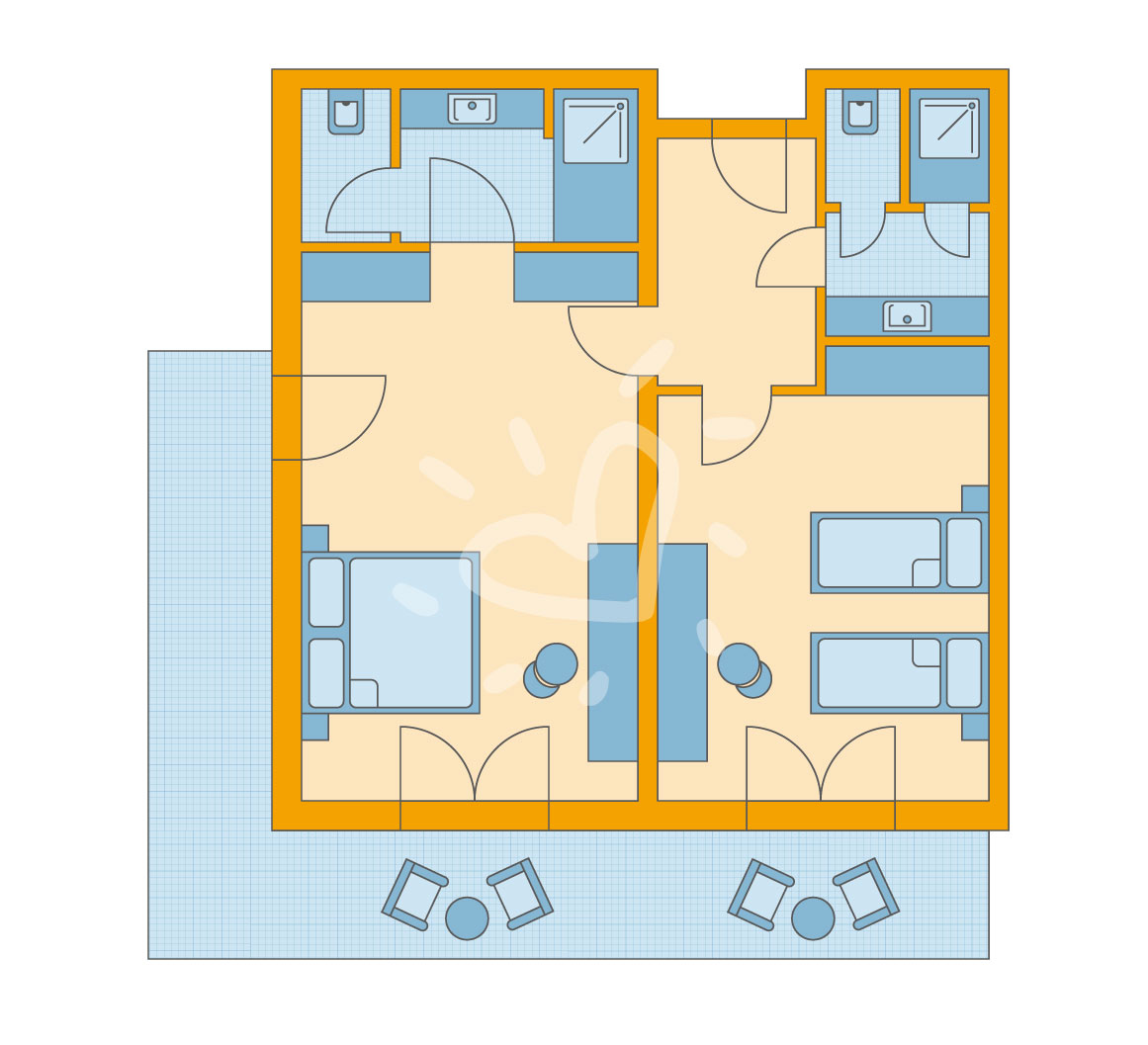 Details anzeigenNichtraucherzimmer, Neubau, ca. 65 m² Gesamtanzahl der Räume in diesem Zimmertyp: 2, Aufteilung wie folgt: 2 Schlafzimmer 4 Einzelbetten (100x200cm) Mindest-/Maximalbelegung: mind. 2 Erwachsene und 1 Kind ab 2 Jahren / max. 4 Erwachsene oder 2 Erwachsene und 2 Kinder/Jugendliche 2-17 Jahre
