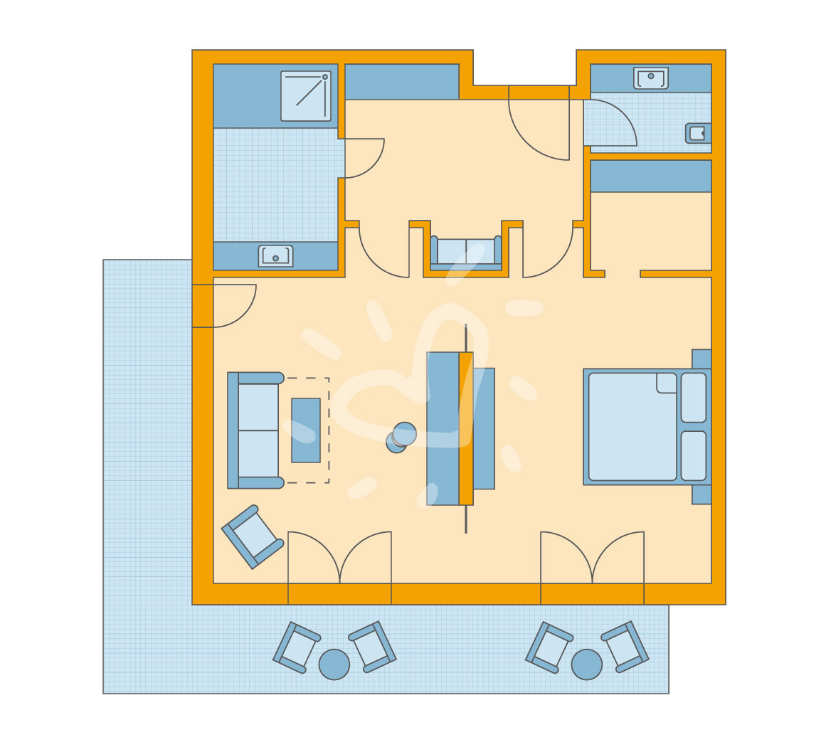 Heizung: Fußbodenheizung Fußboden: Fliesenboden Safe Telefon, Internet: WLAN/WiFi: ohne Gebühr, Fernseher: Flatscreen, deutsches Programm, Sat-TV Reinigungsservice: täglich Dusche, WC, Bademantel: ohne Gebühr, Föhn, Kosmetikspiegel Terrasse: mit SitzgelegenheitSafeWLANTVKlimaanlage -