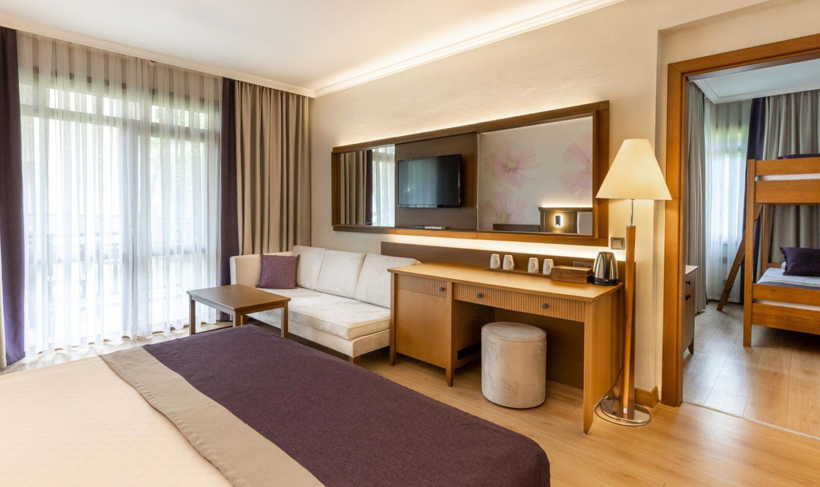 Details anzeigenFamilienzimmer, Nichtraucherzimmer ca. 38 m², letzte Komplettrenovierung 2023, Gesamtanzahl der Räume in diesem Zimmertyp: 2, Aufteilung wie folgt: kombiniertes Wohn-/Schlafzimmer, 1 Schlafzimmer, 2 Einzelbetten, 1 Doppelbett, 1 Schlafsofa, Babybett: ohne Gebühr, Anfrage notwendig